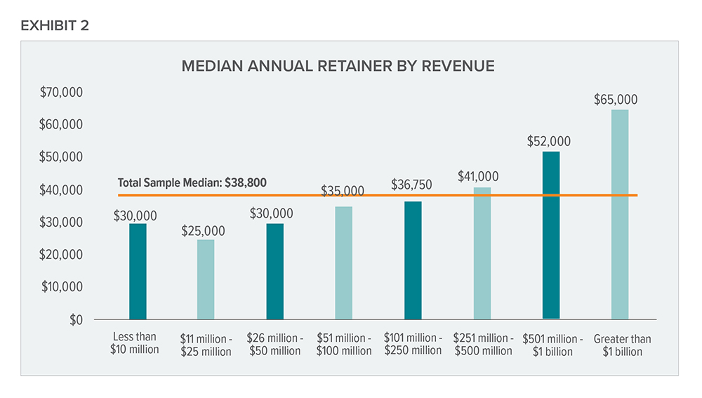 As is the case with executive compensation, board retainers for nonemployee directors are highly correlated with company size, as is shown in exhibit 2.
