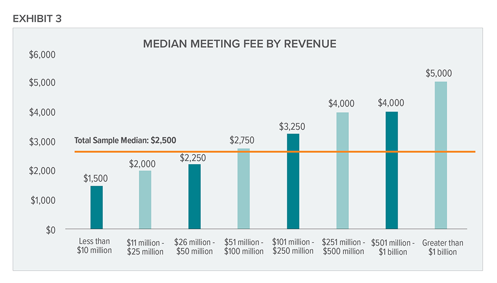 The median meeting fee paid by survey participants remains $2,500, consistent with the last four iterations of the survey. Meeting fees also are correlated with company size, as is shown in exhibit 3.