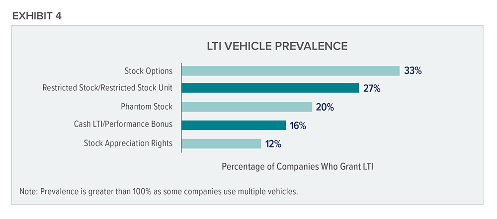 Of the companies that provide long-term incentives to directors, real equity — such as restricted stock or restricted stock units and stock options — is the favored vehicle (see exhibit 4).