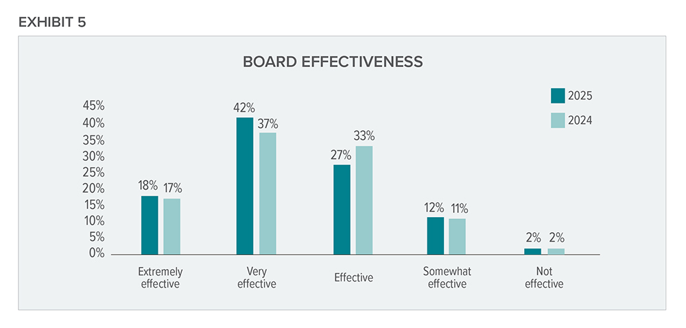 The survey asked respondents about the effectiveness of their boards. The respondents overwhelmingly reported their boards are effective, with 87% rating them as effective to extremely effective. This indicates private companies view having a board as a valuable investment (see exhibit 5).
