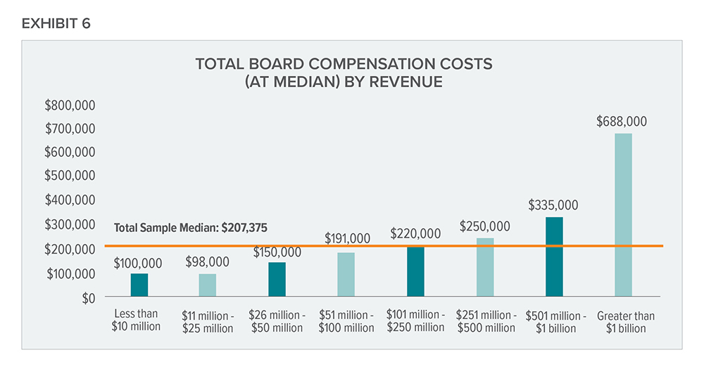Additionally, the survey considers the average annual total board compensation expense as a percentage of revenue across different revenue bands (see exhibit 7).