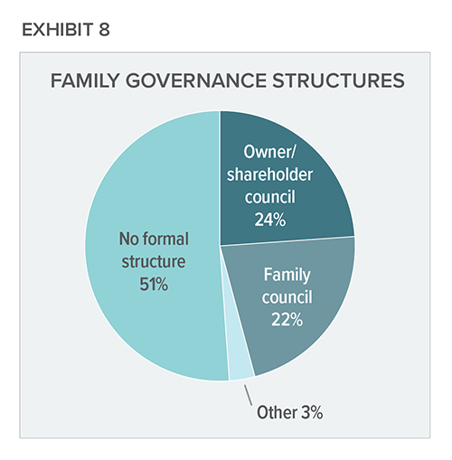 For the first time, the 2025 version of the survey gathered data for family and owners councils to better capture the scope of governance forums at family companies (see exhibit 8). Family (or owners) councils are comprised of select members who represent the family (or owners) in matters of importance. Generally, the council is the primary forum for communication and education of the family for the purpose of sustaining engagement in the business. For example, the council may develop education programs on the family’s business, the meaning of shared ownership and proper governance. The family council may also review business financial statements and future investments, the company’s dividend policy, succession planning, family member employment practices, family apprenticeship programs and more.
